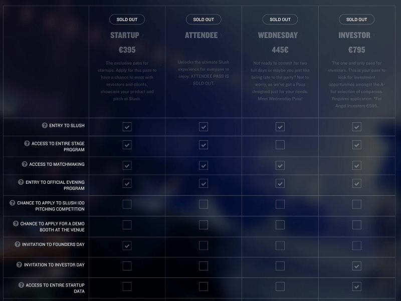票價從395–795歐元不等,而且你沒有看錯,投資人要付創業公司兩倍的票價的795歐元才能進場,而且Slush也擁抱所有朋友,開放單日票/雙日票讓一般大眾進場一窺Slush大會的神祕。